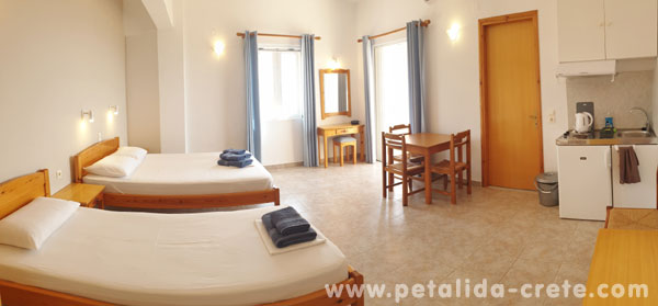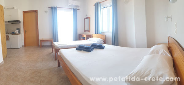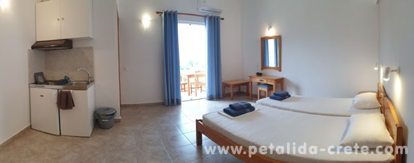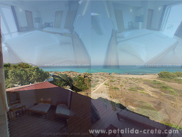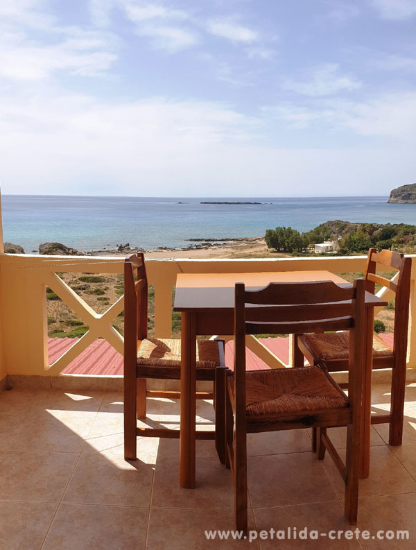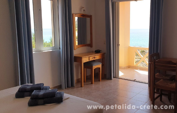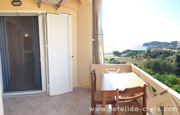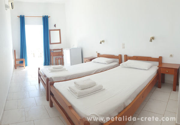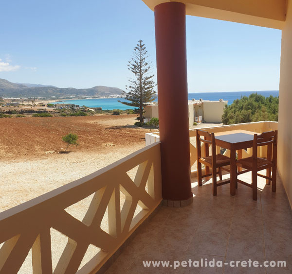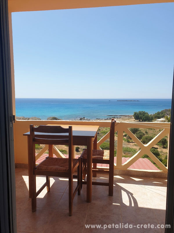 Our double rooms are in the bungalow building and are equipped with air condition and a refrigerator. They have also a private bathroom and a small balcony with view to the sea or the coastal plain of Falassarna.