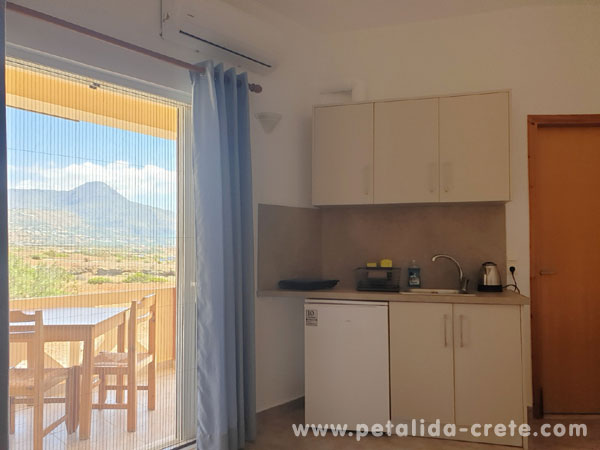 Our Studios are on the first floor and are equipped with air condition, a kitchenette, a kettle, a hairdryer and mosquito nets on the doors and windows. There is a private bathroom and a balcony with view to the sea.